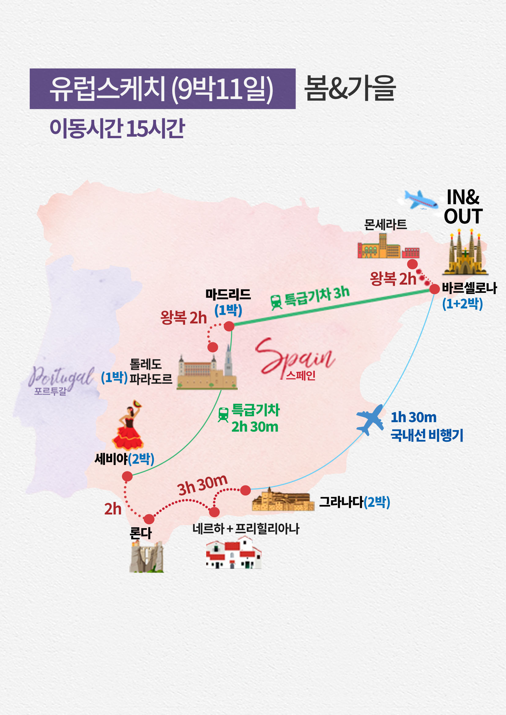비행기표도 비싸고 스페인까지 직항 비행기 시간이 15시간인데 7~8박은 아깝잖아요. 9박 합니다.
