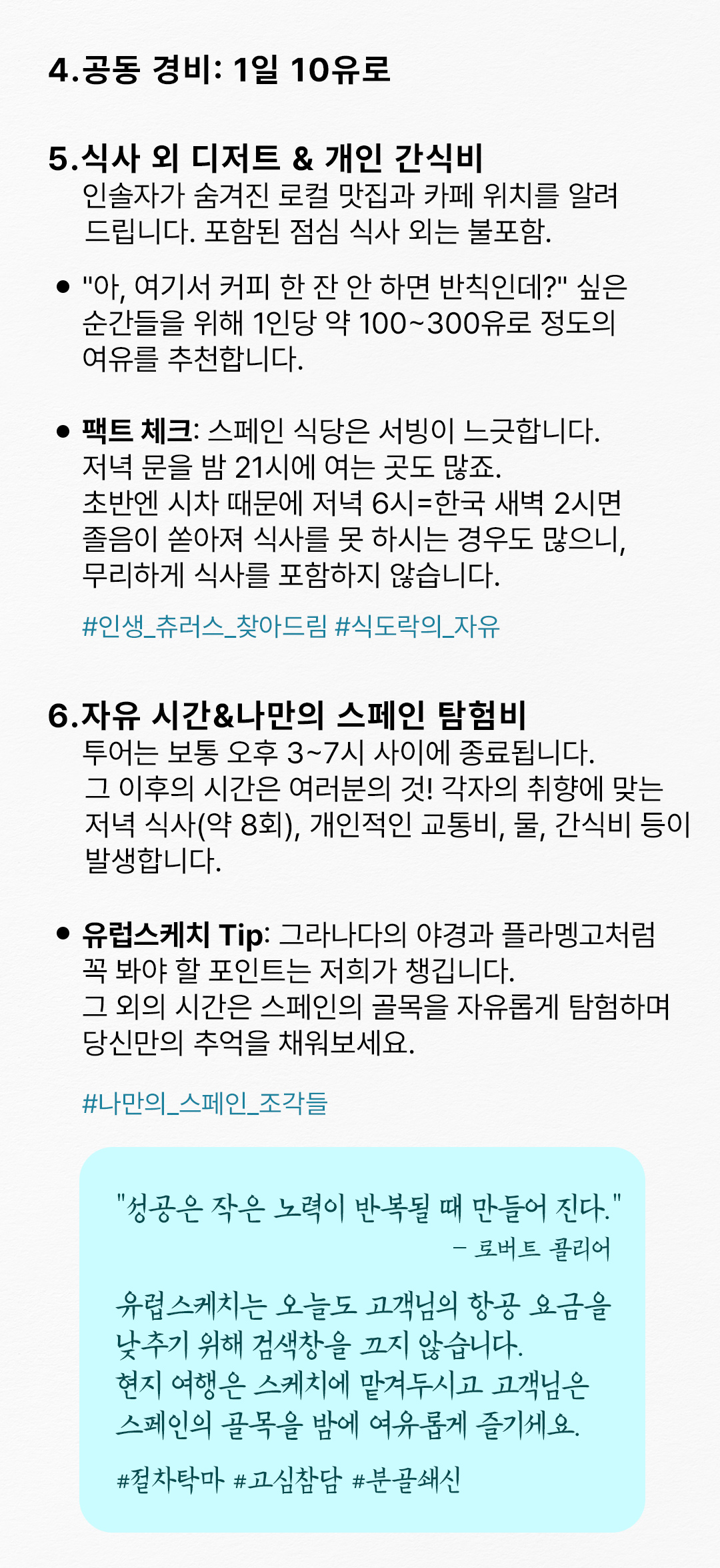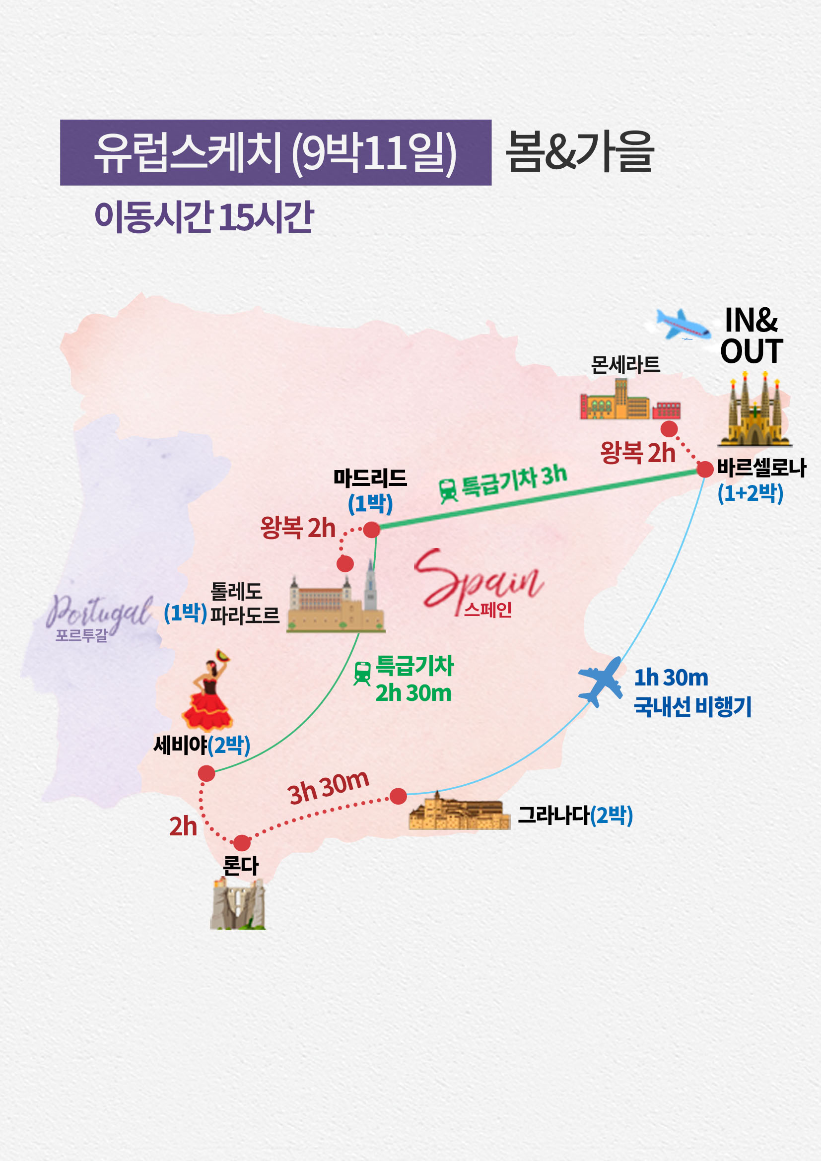 가장 중요한 바르셀로나의 체류시간이 매우 짧고 + 하루종일 비행기 타고 파리에서 한참 대기하다가 오셔야 되서 하루 날립니다.