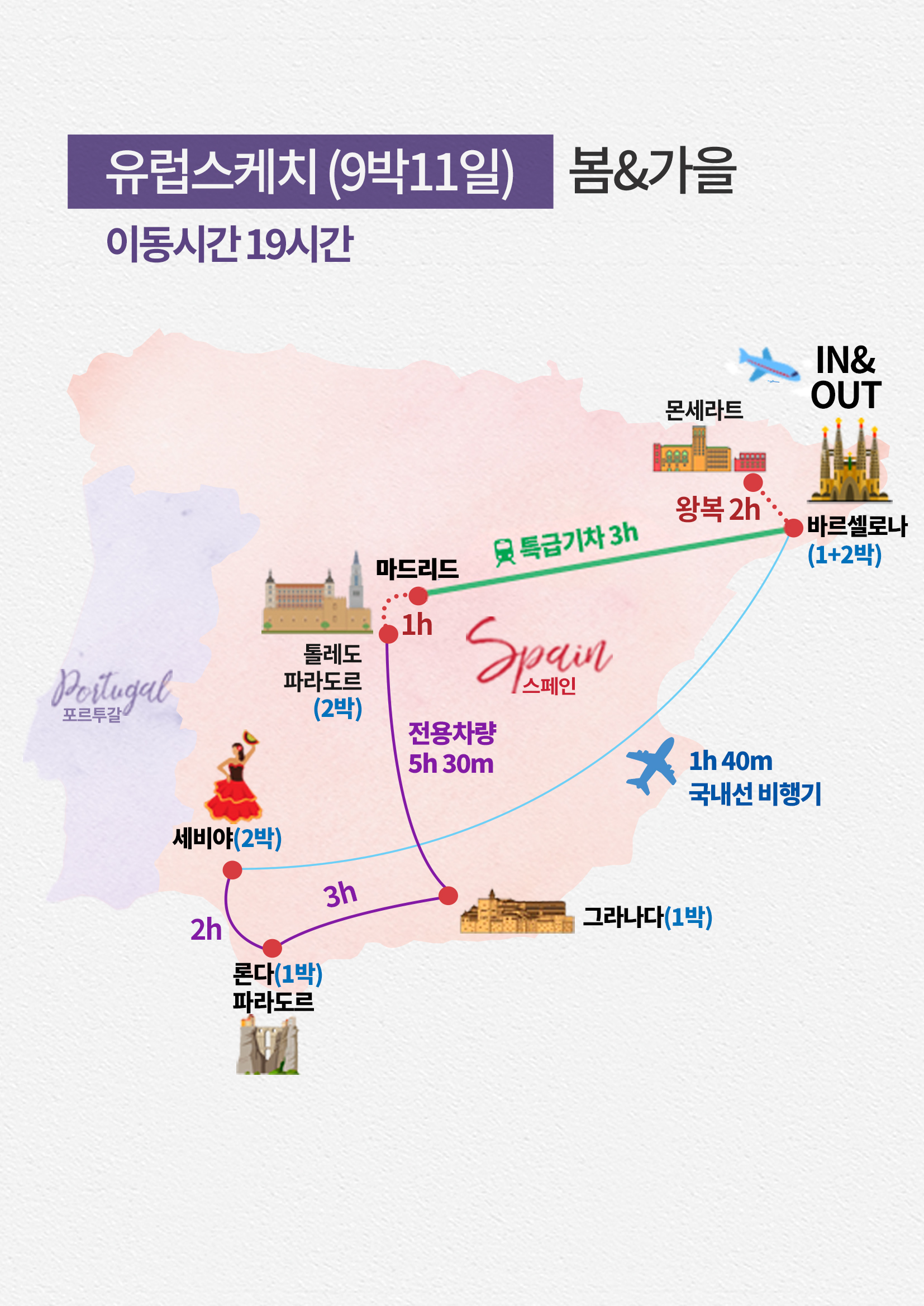 가장 중요한 바르셀로나의 체류시간이 매우 짧고 + 하루종일 비행기 타고 파리에서 한참 대기하다가 오셔야 되서 하루 날립니다.