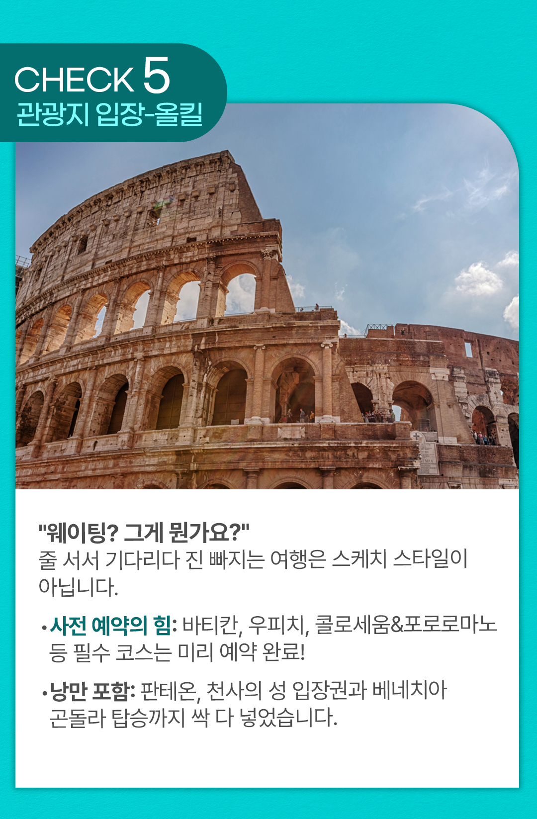 입장지 : 바티칸, 우피치, 콜로세움&포로로마토, 판테온, 천사의 성 입장