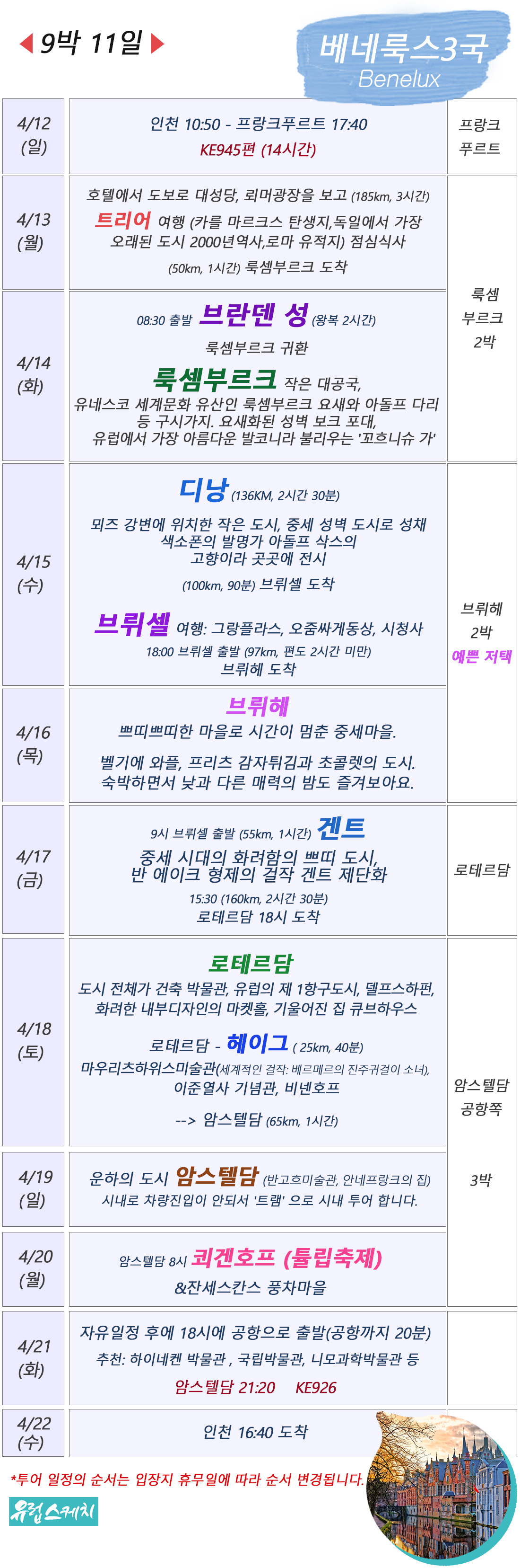 네덜란드의 활기찬 암스테르담 운하에서 보트 투어를 즐기고, 잔세스칸스의 풍차와 쾨켄호프의 튤립(시즌에 따라)을 배경으로 인생샷을 남겨보세요!